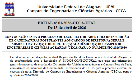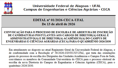 A Comissão Eleitoral responsável pelo processo de escolha da Direção torna público o edital que regulamenta a eleição para os cargos de Diretor(a) Geral (Administrativo) e Diretor(a) Acadêmico(a) do Campus de Engenharias e Ciências Agrárias da Universidade Federal de Alagoas (UFAL), referente ao quadriênio 2026/2030 .